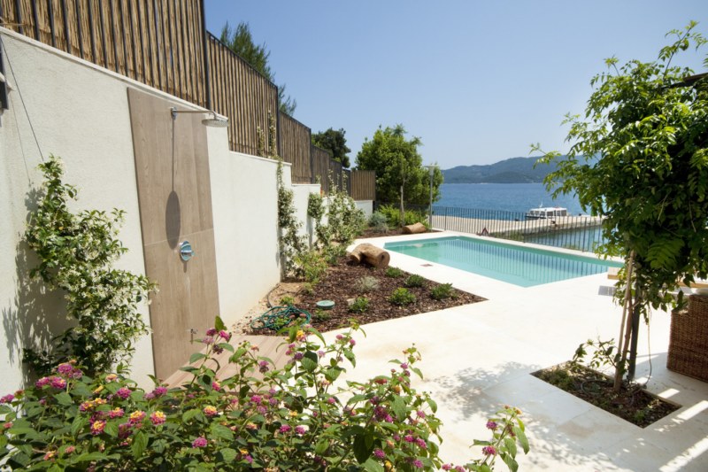 Apartments are part of a newly built object in an ideal location. The town centre is only two minutes away. The house is situated by the sea just a few steps from the beach.The building next-door has a grocery store and a cash machine, and a little dock from which the boat departs three times a day is right accross the road. The groundfloor features a huge storage room for surf equipment so that all surf lovers can enjoy their favourite sport practically from the porch, without carrying around all the equipment. The building has many green areas and horticulture receives a great deal of attention. In addition to beautiful plants, our garden has orange, lemon and rosehip trees. The big central terrace features deck chairs and a swimming pool for a quick dip. There are also two barbecues at our guests’ disposal for their summer dinner parties.